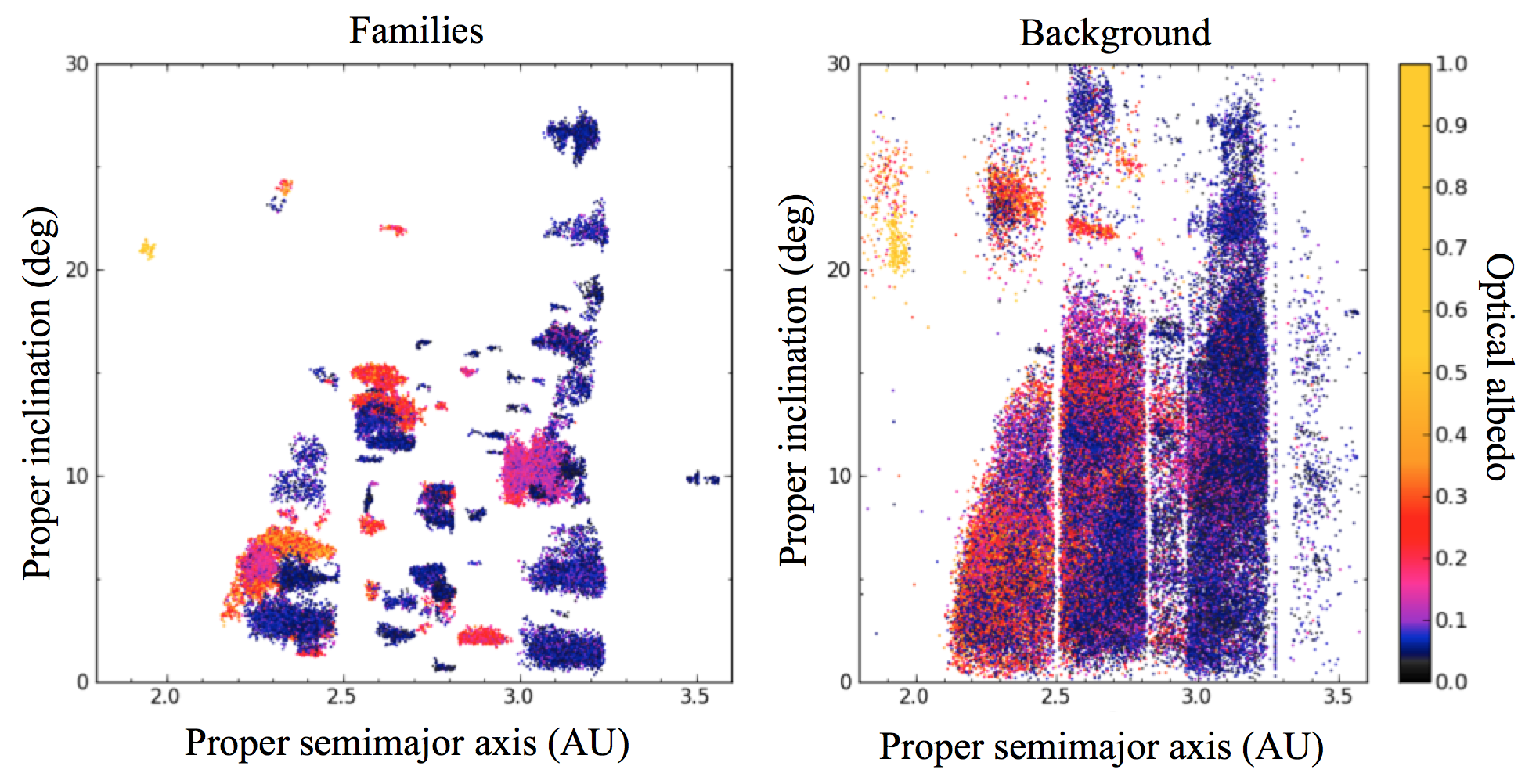 For now, here is a plot showing the albedos of asteroids families compared to objects not in families: